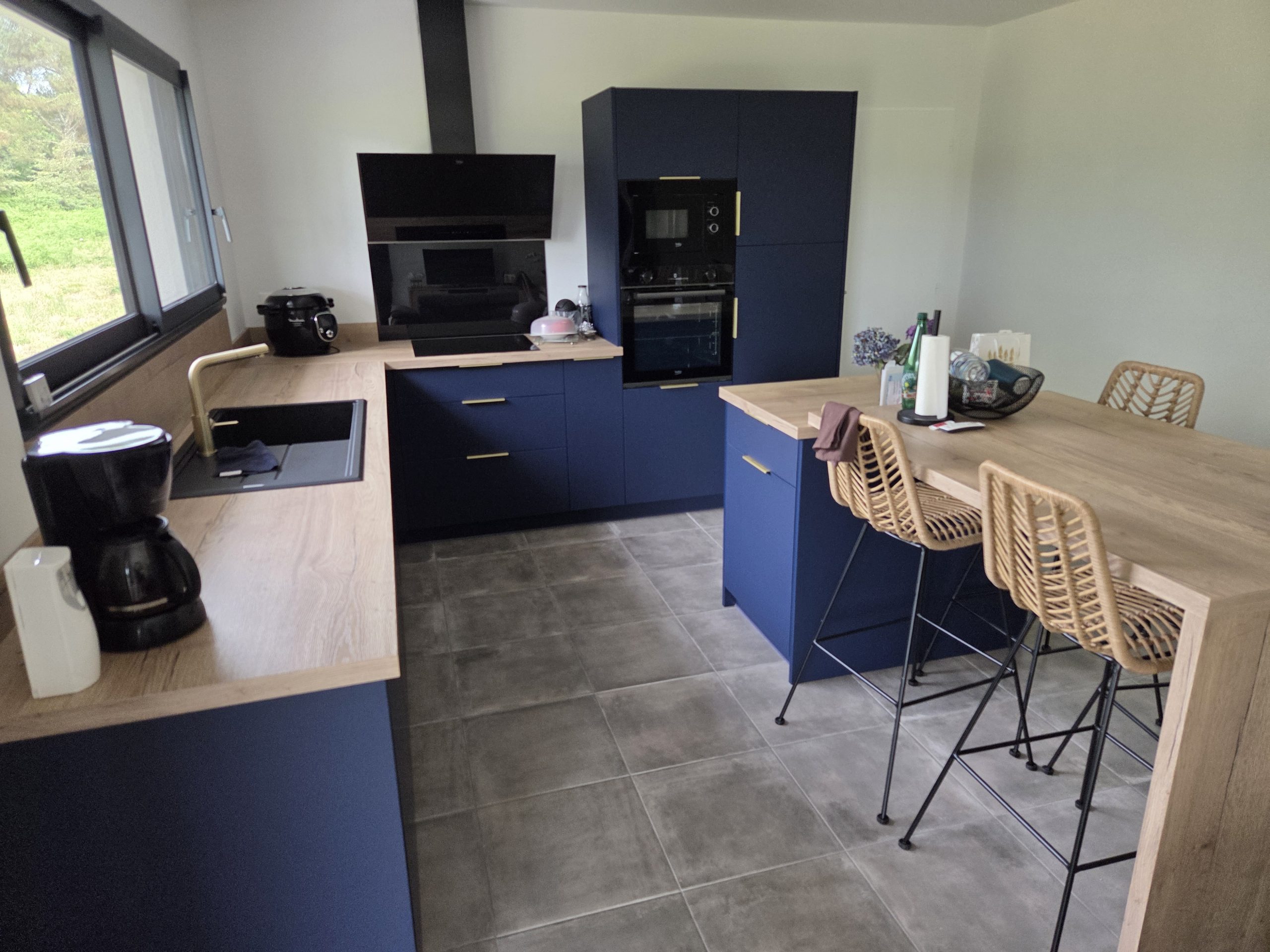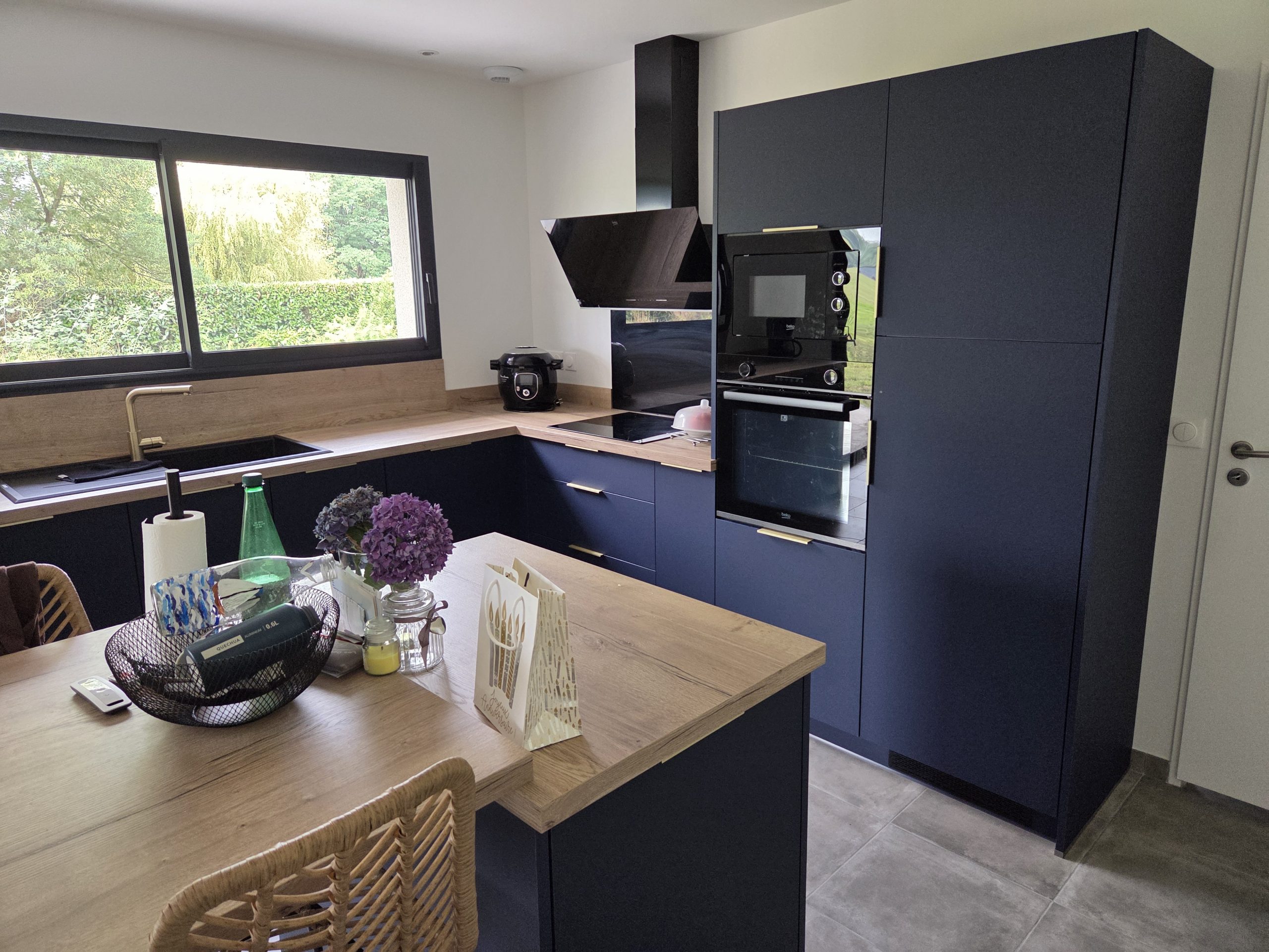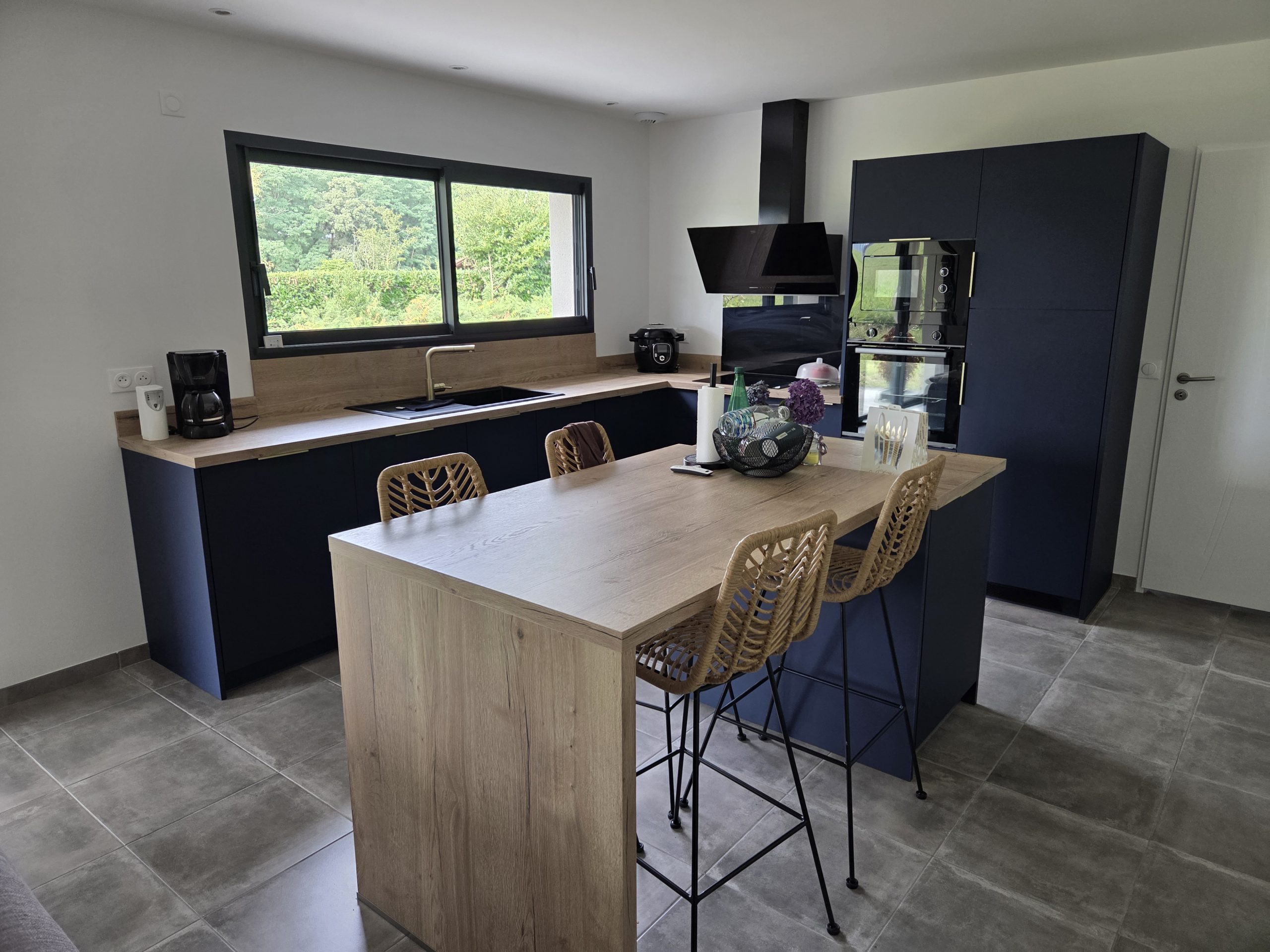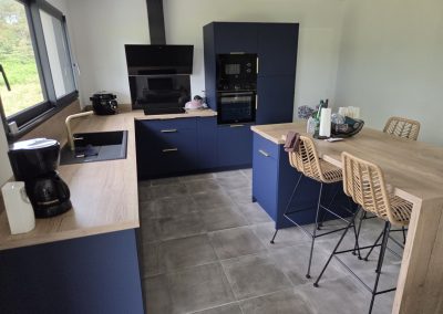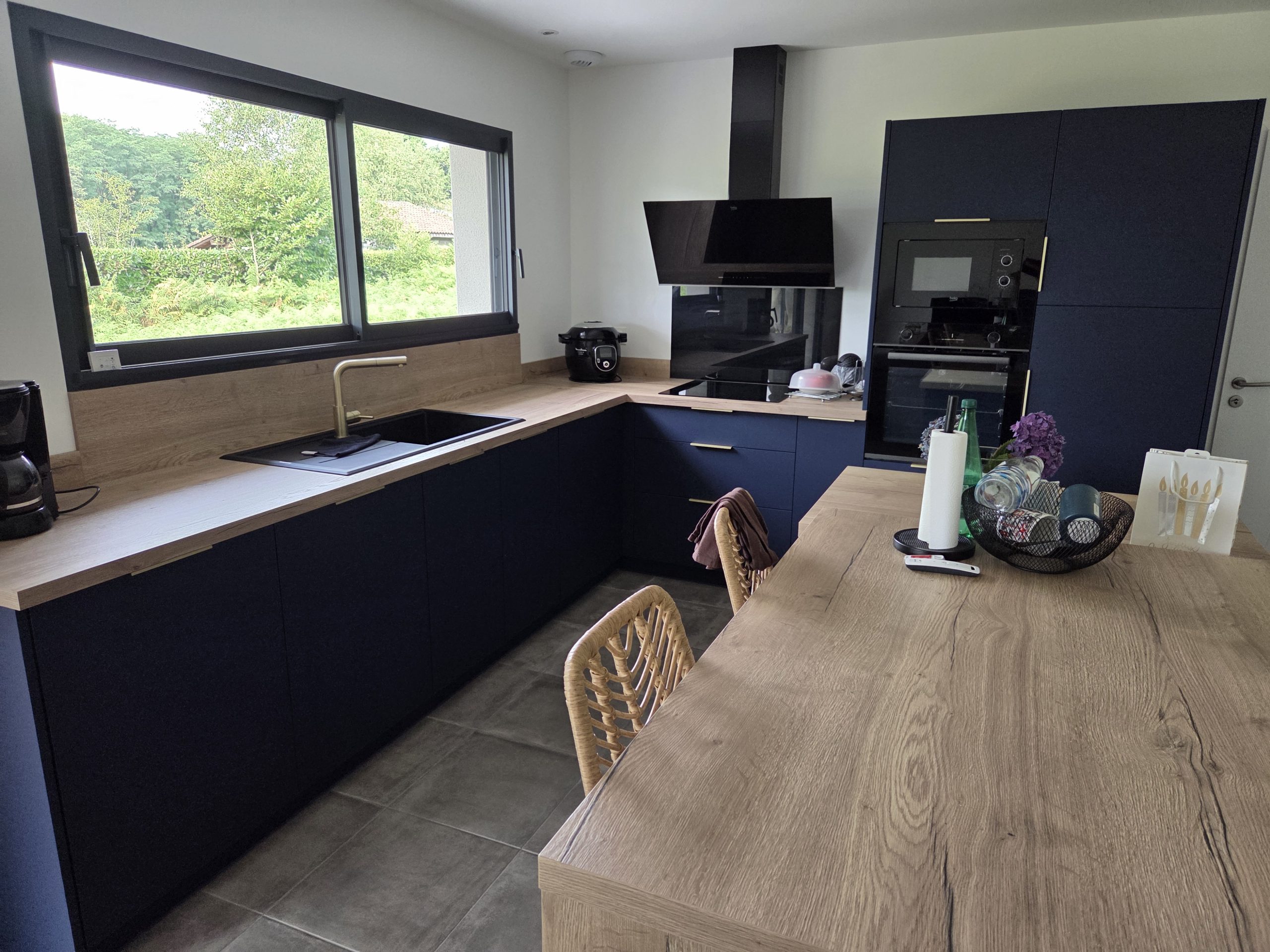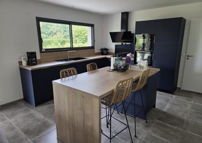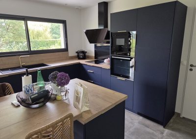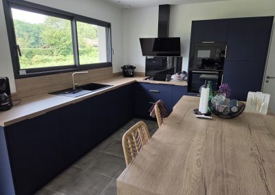 Les détails pratiques n’ont pas été oubliés : un évier sous plan noir, un fond de hotte assorti et des électroménagers en finition noire viennent renforcer l’harmonie visuelle de l’espace. Chaque élément a été pensé pour combiner esthétisme et confort d’utilisation. Avec cette réalisation, Agencement Daudignan démontre encore une fois son savoir-faire en matière de cuisines contemporaines sur mesure dans les Landes, en proposant des solutions uniques, adaptées au mode de vie et aux envies de ses clients.