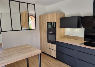 À l’entrée, un claustra en bois de sapin accueille les visiteurs avec une touche de nature et de charme rustique. Cet élément décoratif renforce l’identité unique de cette cuisine, alliant fonctionnalité et esthétisme. Avec des finitions impeccables et un agencement pensé pour optimiser l’espace et le rangement, cette cuisine à Hagetmau est une véritable œuvre d’art où chaque détail est soigneusement élaboré par Agencement Daudignan, transformant votre espace de vie en un lieu chaleureux et convivial.